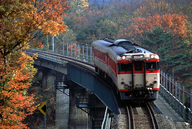 紅葉と北上線の気動車 北上線和賀仙人〜ゆだ錦秋湖にて 2003年11月3日(月)撮影